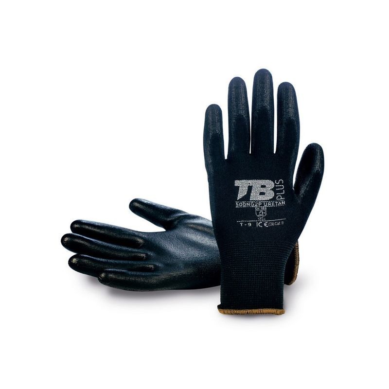 Guante soporte poliéster negro sin costuras. Recubrimiento poliuretano negro en palma. Puño elástico. Galga 13.