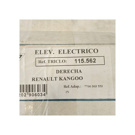 ELEVALUNAS DELANTERO DERECHO ELECTRICO PARA LOS MODELOS: RENAULT KANGOO 1997-2003 REFERENCIA: 115562 PRODUCTO NUEVO MARCA TRICLO ENVIAMOS A TODA ESPAÑA