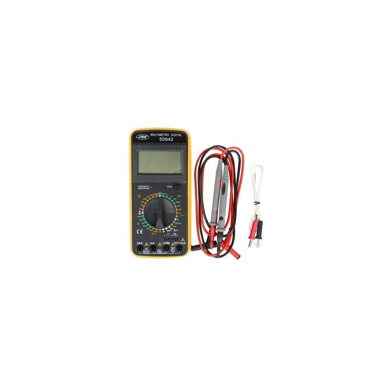 Medición voltaje corriente alterna (AC) 200mV, 2V, 20V, 200V, 1000V Medición voltaje corriente continua (DC) 200mV, 2V, 20V, 200V, 750V Medición intensidad corriente alterna (AC) 20mA, 200mA, 20A Medición intensidad corriente continua (DC) 20mA, 200mA, 20A Medición resistencia (Ω) 200O, 2KO, 20KO,200KO, 2MO, 20MO, 2000MO Medición capacitancia (F) 2nF, 20nF, 200nF, 2μF, 20μF, 200μF Temperatura de trabajo -40°C /1000 °C Peso 0,35Kg Dimensiones (LxAnxAl) -
