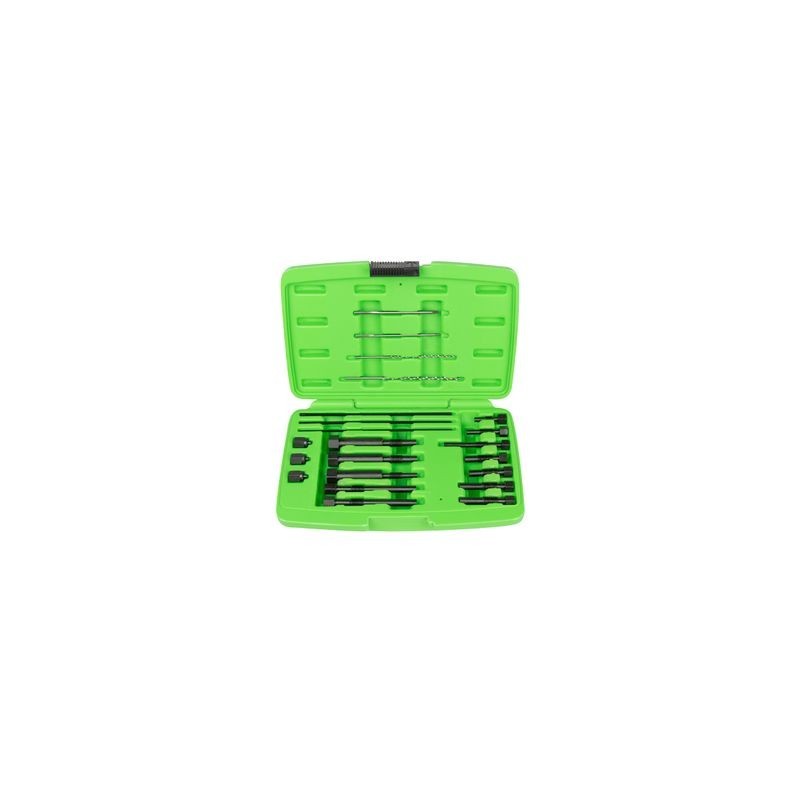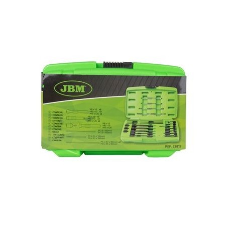 Útiles especialmente diseñados para extraer puntas de electrodo de calentador en caso de rotura durante el proceso de extracción. Contiene diferentes medidas para una adaptación versátil. Facilita la extracción sin necesidad de levantar la culata. MEDIDAS: x2 M8x1.0 x2 M10x1.0 x2 M10x1.25 x1 M8x1.0 x1 M10x1.0 x1 M10x1.25 x1 M8x1.0 x1 M10x1.0 x1 M10x1.25 x1 ø2.5x120mmL x1 ø3.3x140mmL x1 M3x0.5x100mmL x1 M4x0.7x100mmL x1 M3x0.5x180mmL x2 M4x0.7x180mmL