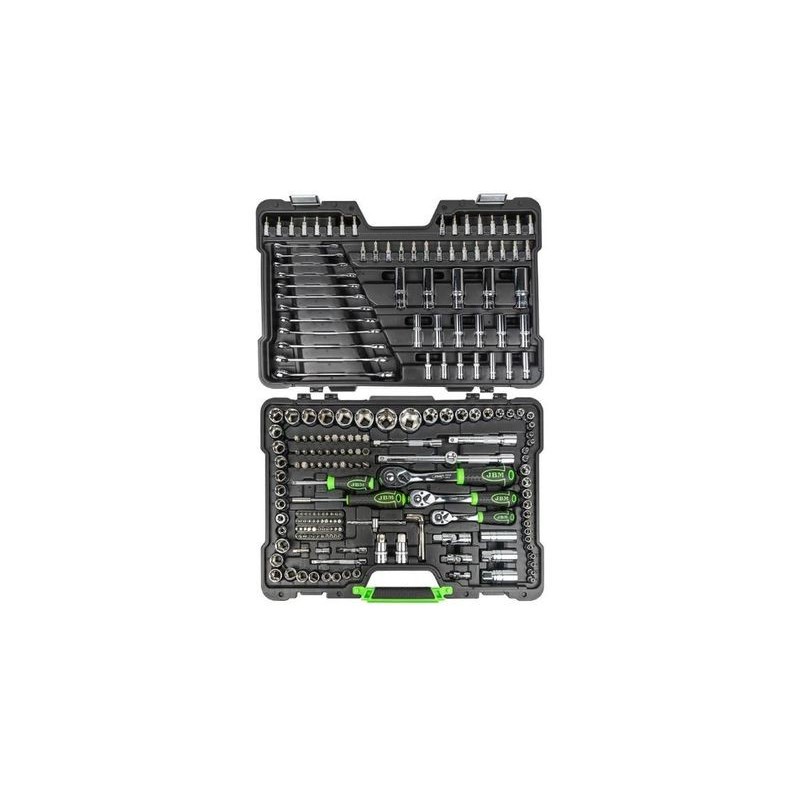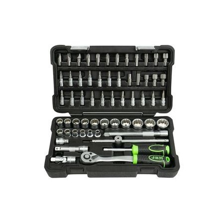Maletín de Herramientas profesional 54045 Herramientas de 1/2" Herramientas de 1/4" 13 vasos métricos hexagonales de: 4, 4.5, 5, 5.5, 6, 7, 8, 9, 10, 11, 12, 13 y 14mm 7 vasos métricos largos hexagonales de: 4,5, 6, 7, 8, 9 y 10mm 5 vasos torx: E4, E5, E6, E7 y E8 1 carraca de 72 dientes con expulsor de vasos 1 articulación universal 1 mango destornillador 2 barras de extensión de 50mm y 100mm 1 mango corredizo 1 adaptador de cabezales (6mm) 30 cabezales para el mango destornillador Estrella: #0, #1, #2 // Estrella doble: #0, #1 y #2 Allen: 3, 4, 5 y 6mm // Plano: 4, 5.5, 6.5 y 7mm Torx: T8, T9, T10, T15, T20, T25, T27 y T30 ETC