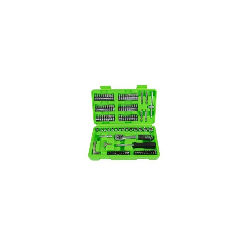 Herramientas de 1/4": 13 vasos métricos hexagonales: 4, 4.5, 5, 5.5, 6, 7, 8, 9, 10, 11, 12, 13, 14mm 1 adaptador para puntas 1 carraca de 72 dientes con expulsor de vasos 1 barra de extensión de 50mm 7 llaves allen : 1.27, 1.5, 2, 2.5, 3, 4, 5mm 1 mango corredizo 1 mango destornillador 1 punta para atornillar Puntas 25mm largo: Estrella: PH0(x2), PH1(x2), PH2(x4), PH3(x2) Estrella doble: PZ0(x2), PZ1(x2), PZ2(x4), PZ3(x2) Plana: 3, 4, 4.5, 5, 5.5, 6, 6.5, 7, 8 Torx: T8, T10, T15, T20, T25, T27, T30, T35, T40, T45 Hexagonal: 1/16, 5/64, 3/32, 7/64, 1/8, 9/64, 5/32, 3/16, 7/32, 1/4 Hexagonal: 1.5, 2, 2.5, 3, 4, 5, 5.5, 6 REF: 53953