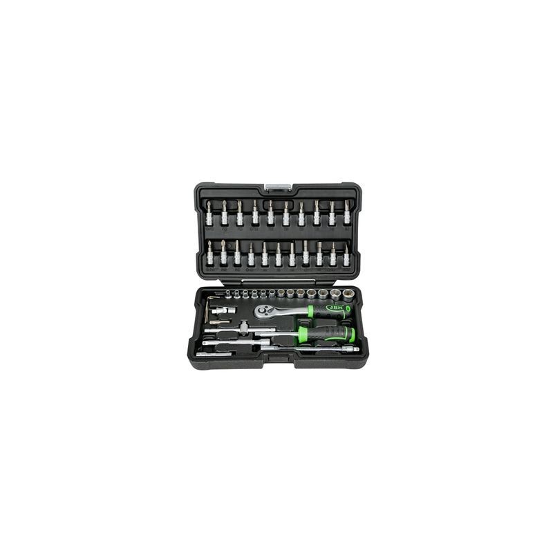 Contenido: Herramientas de 1/4" 1 carraca de 72 dientes con expulsor de vasos 13 vasos métricos hexagonales: 4, 4.5, 5, 5.5, 6, 7, 8, 9, 10, 11, 12, 13, 14mm 2 barras de extensión: 50, 100mm 1 articulación universal 1 mango corredizo 1 barra de extensión flexible 1 mango destornillador 1 adaptador para cabezales de 1/4" 21 cabezales para el mango destornillador: 3 Plano: SL4,SL5.5,SL7 3 Estrella: PH1,PH2,PH3 3 Estrella doble: PZ1,PZ2,PZ3 6 Allen: H3,H4,H5,H6,H7,H8 6 Torx: T10,T15,T20,T25,T30,T40 4 llaves allen: 1.27, 1.5, 2.0, 2.5mm REFERENCIA: 54109